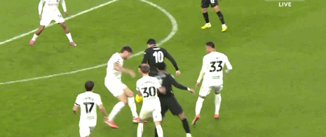 第40分钟,扳平比分,多库内切后射门击中后卫折射入网,曼城1-1